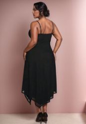 Questo abito nero è l'epitome dell'eleganza moderna, con un taglio aderente che esalta le curve generose. Lo spacco laterale scopre sottilmente la gamba, creando quel look sofisticato che caratterizza gli outfit da cocktail di successo.