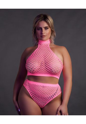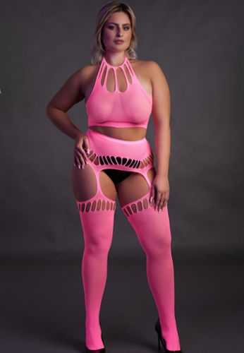 Set taglia grande molto elasticizzato con reggicalze e top coordinato.