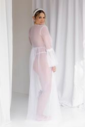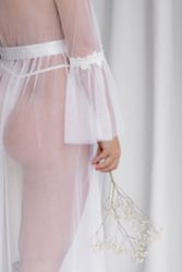 Tulle trasparente ornato da graziosi ricami tono su tono sulla scollatura e sulle maniche.