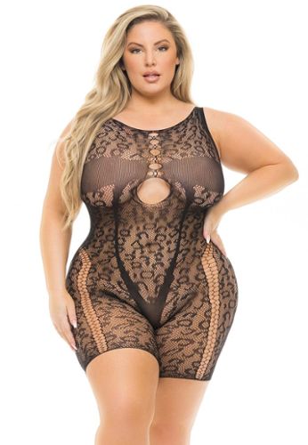 Descubra este bodystocking de rede floral preta que realça as suas curvas generosas com o seu detalhe de renda nas costas e os suspensórios.
