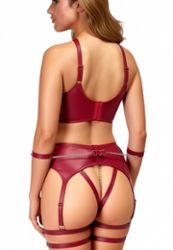 Een donkerrode matte set die meteen blijft hangen: beugelloze bh, open string in harness-stijl, een ketting die prikkelt… en zachte boeien om het spel te starten.