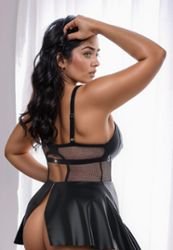 A babydoll that tells a story of seduction. The subtle blend of faux leather and mesh creates a unique design that boldly embraces your curves. The detachable leg harnesses allow you to personalize your look by attaching your favorite stockings. The wide adjustable straps guarantee a perfect fit and absolute comfort.