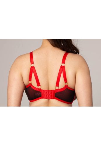 Een sexy, zeer originele balconette bh met een onberispelijke ondersteuning. Hier verkrijgbaar in zwart en rood. Zorg ervoor dat je je onderbustemaat weet, want we passen dit unieke model niet aan!