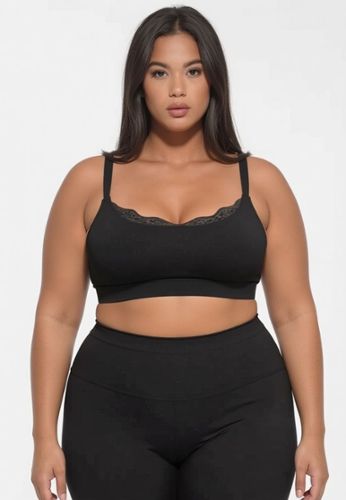 Een zwarte seamless bralette voor elke dag: 360° stretch met licht comfort, zonder beugel en zonder vulling, met een dubbellaagse voorkant voor extra bedekking. De ronde hals met kant geeft een speelse, sexy touch, en de brede rug helpt visueel glad te maken.
