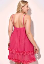 het elastiek onder de buste is natuurlijk gepositioneerd om de taille te markeren zonder aan te spannen. De twee ruches vallen sierlijk tot aan de knieën en creëren een vrouwelijk, romantisch silhouet. Deze chemise kan worden gedragen voor een knuffelige avond in of een intieme avond van verleiding.
