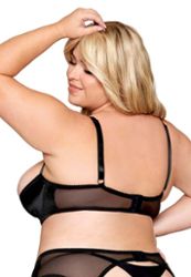 Beugelbeha van satijn met open cups en fijne visnet achterkant.
