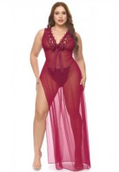 Lange chemise grote maten bordeaux kant V-hals split strik