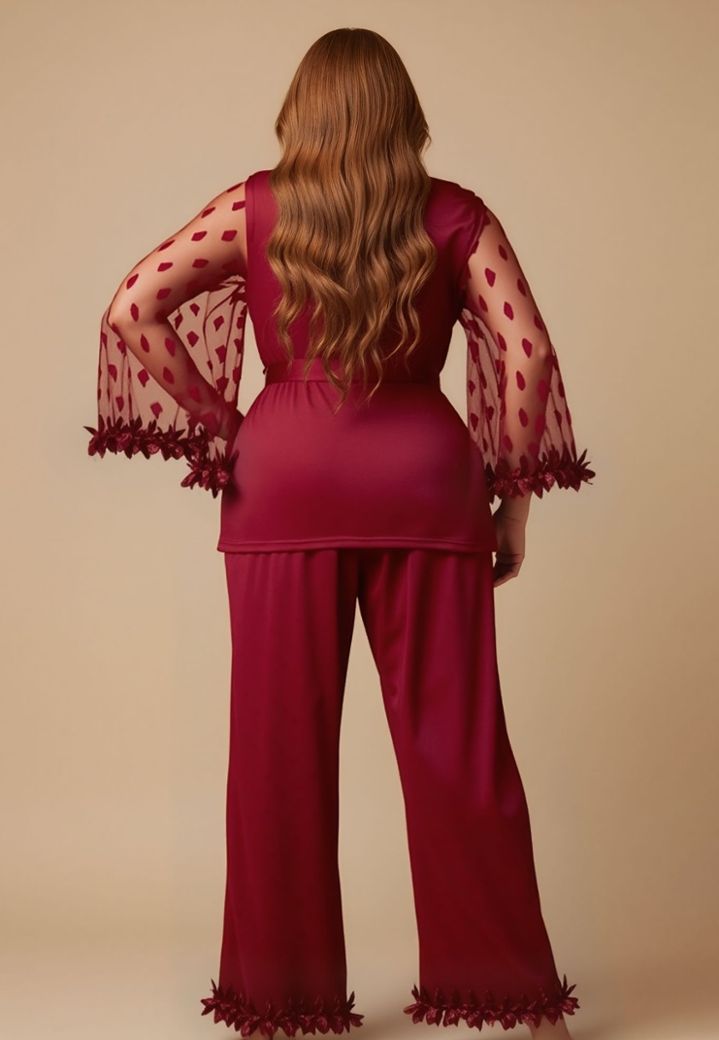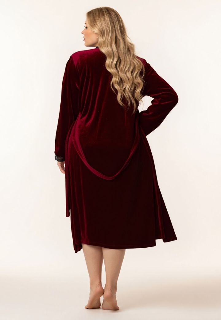 Het Ensemble Sweet Night is de definitie van sexy comfort. Nachtjapon in bordeaux fluweel elastisch, geslitst aan de zijkant, zoom in kant. Bijpassende kimono in elastisch fluweel, zwarte kant op de opening en mouwen. Riem om vast te binden. Een ensemble zacht, elegant en onweerstaanbaar.