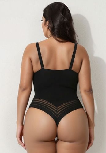 Ontdek deze zwarte bodysuit met geraffineerde visnetdetails die perfecte ondersteuning biedt en tegelijkertijd je sensualiteit onthult.