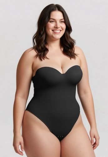 Een ultra veelzijdige zwarte corrigerende body: voorgevormde cups met beugel voor steun, anti-slip silicone om hem strapless te dragen, en een dubbele laag die taille en buik gladmaakt met comfortabele stevigheid.