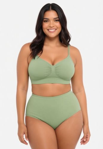 Een amandelgroene bh met een second-skin gevoel en een nette lijn onder kleding. De rimpeling aan de voorkant geeft een natuurlijke vorm, de verstelbare bandjes zitten comfortabel, en de hoge zijkanten helpen de ruglijn gladder te maken.
