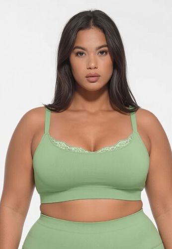 Een amandelgroene seamless bralette voor elke dag: 360° stretch met licht comfort, zonder beugel en zonder vulling, met een dubbellaagse voorkant voor extra bedekking. De ronde hals met kant geeft een speelse, sexy touch, en de brede rug helpt visueel glad te maken.