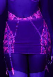 De Nova Blacklight set zorgt voor een revolutie in de kunst van het verleiden met zijn exclusieve fluorescerende geborduurde kant die je onder UV-licht verandert in een lichtgevende godin. Technische innovatie creëert een opvallend visueel spektakel dat de aandacht trekt.