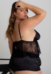 Een setje met een verstelbaar rugtopje met satijnen cups en een fijn kanten lijfje, onderaan uitgesneden.