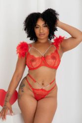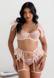 Een beugel bh, tot cup D-E max, en het is een pronkstuk, geen steun. Hij is supermooi en heel origineel met veertjes op de bandjes en kettinkjes op de buste.