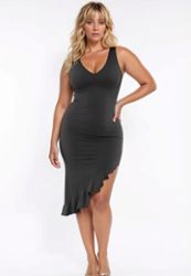 Zwarte corrigerende jurk seamless diepe V-hals asymmetrische volant mouwloos grote maten