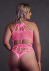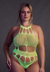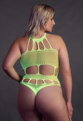 Uma gola soberba e recortes soberbos para este body plus size em malha bodystocking.