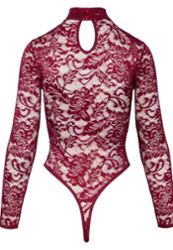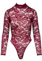 Body fio dental em renda bordô com mangas compridas e pequeno colarinho alto para uma silhueta muito sexy. Cava alta e fecho de pressão na entreperna.