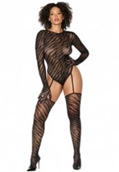 Este bodystocking zebra destaca as curvas com mangas longas e luvas de dedos, costas abertas com gota, tanga, jarreteiras e meias combinando. Efeito wild, modelador e elástico.