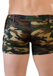 Umas calças de homem que combinam estilo e sensualidade: microfibra macia com padrão de camuflagem, inserções em preto mate nas laterais e na frente e faixas com argolas para um toque mais ousado. Com presilhas para ajustar o seu look.
