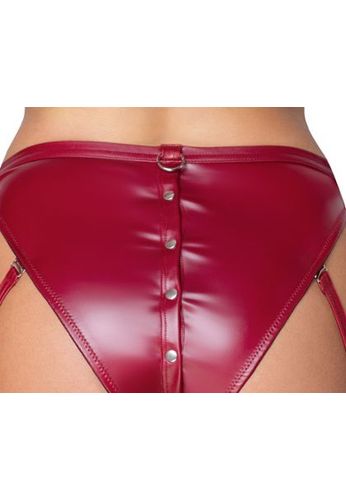 Conjunto de duas peças em couro sintético elástico e renda de qualidade, com correntes douradas e gargantilha removível. Cueca alta totalmente aberta na entreperna, com ligas removíveis e reguláveis.