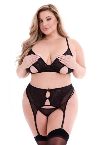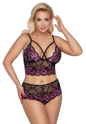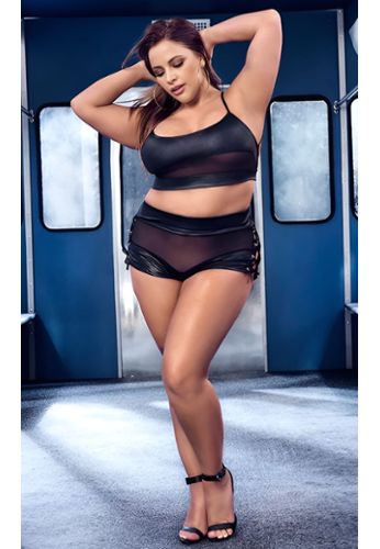 Sensualidade e conforto combinados em um conjunto duas peças tamanho grande. Combinação de tecido wet look brilhante e voile transparente. Detalhe em tela sob o busto e ilhós cruzados nas laterais para um toque ousado.