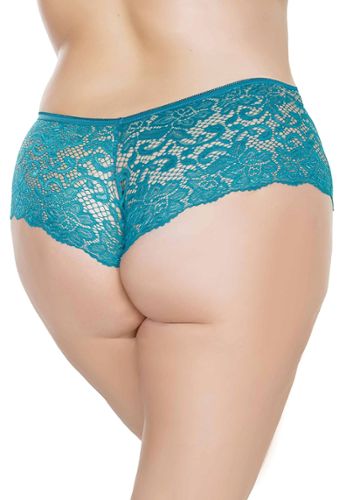 Tanga de renda de cintura alta que assenta bem na barriga. Mostrada aqui em verde.