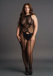 Macacão de bodystocking em tamanho grande, luxuosamente trabalhado e aberto na virilha.