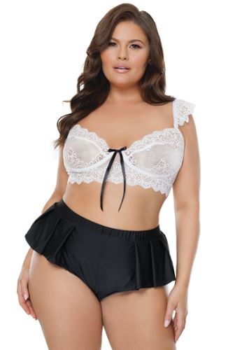 A minissaia plissada com acabamento em renda revela apenas o suficiente. Com o colarinho e a gravata a condizer, os óculos e a regra "Enjoy Every Inch" , este conjunto completo é garantido para tornar as aulas particulares numa brisa.