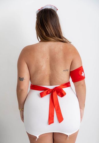 Ligas integradas, uma faixa sexy nas coxas, um chapéu e um estetoscópio completam este fato, que se adapta a todas as formas do corpo.