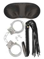 Inclui uma máscara para vendar os olhos do seu parceiro, um chicote com tiras de couro para eventuais castigos e um par de algemas para imobilização, com regulações e chaves.