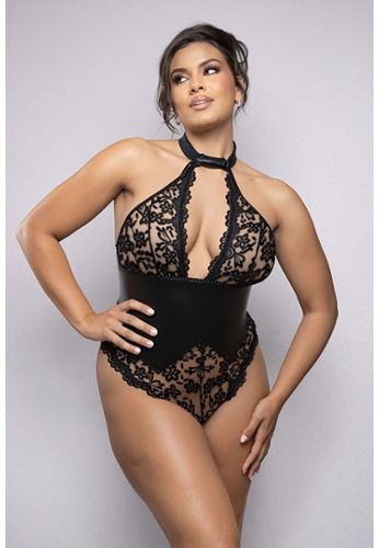 O Body Wetlook e Renda é a encarnação do sexy ousado. Renda floral transparente no peito, wetlook brilhante no corpo, gola halter, sem mangas. Costas nuas com cordões sensuais. Zíper central. Um body que faz virar cabeças.