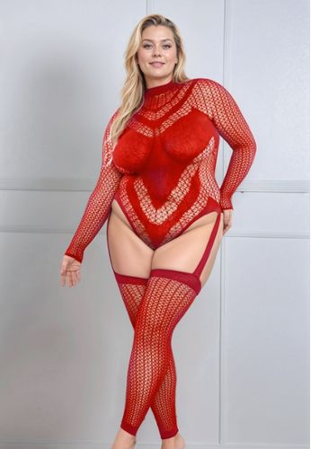 Este bodystocking vermelho paixão revela a sua ousadia com o seu sofisticado padrão de rede e mangas compridas integradas.