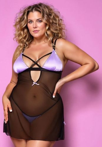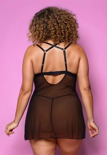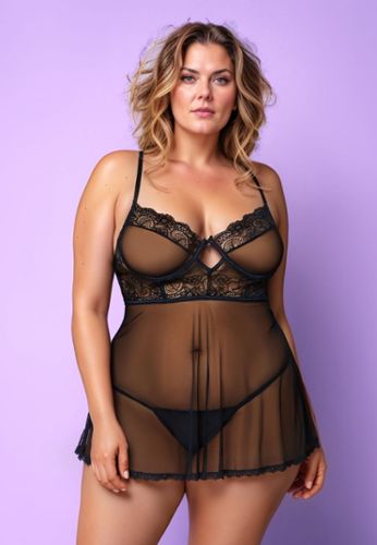 Luxuoso e ultra lisonjeiro, o Babydoll Charlotte em grande tamanho é uma pequena joia: uma combinação de cores e materiais realmente bem-sucedida, com uma caída que segue suas curvas sem constrangê-la. O corpete de cetim elástico é macio e confortável, com xícaras macias e laços entre os seios que atraem o olhar perfeitamente. A saia evasê de tule elástico muito macio traz leveza, e adoramos o jogo de tiras nas costas para um acabamento ultra sexy. E claro: a calcinha a juego está incluída.
