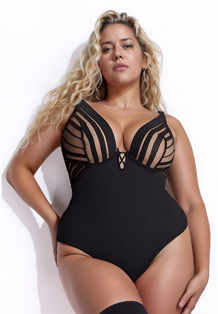 Descubra este body preto com detalhes sofisticados em rede que oferece um apoio perfeito enquanto revela a sua sensualidade.