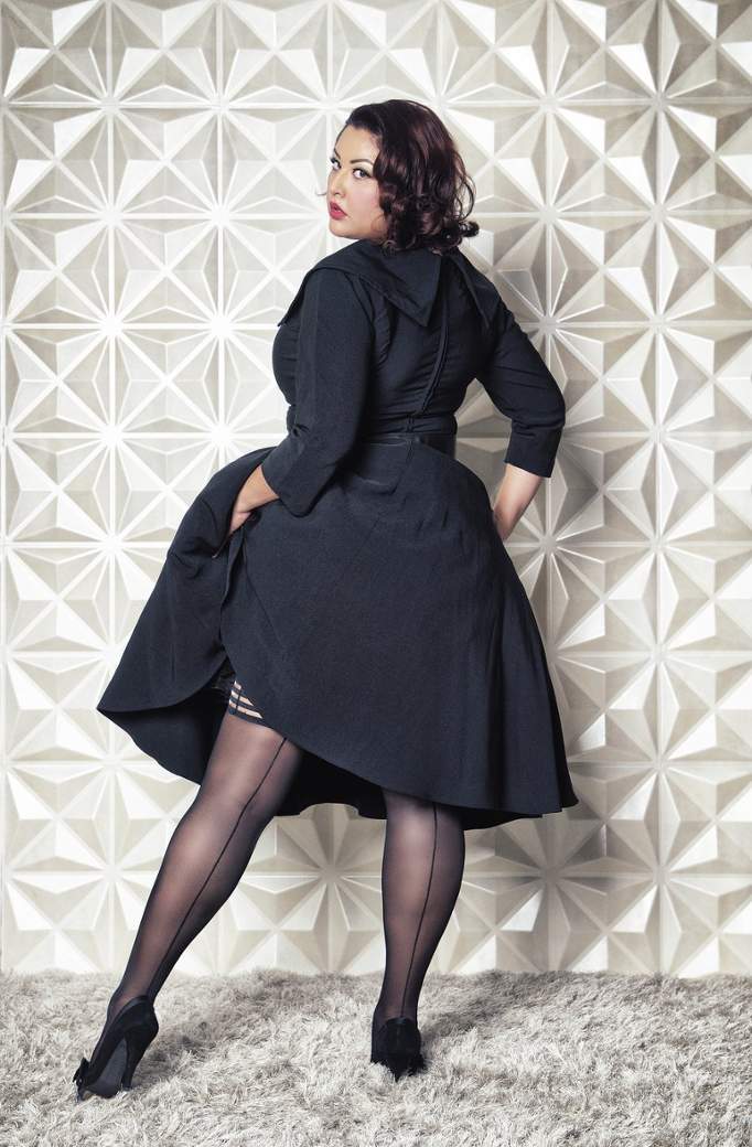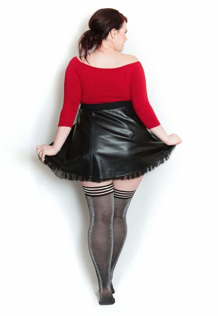 Um conjunto invulgar de rede e vinil plus size para um look muito rock.