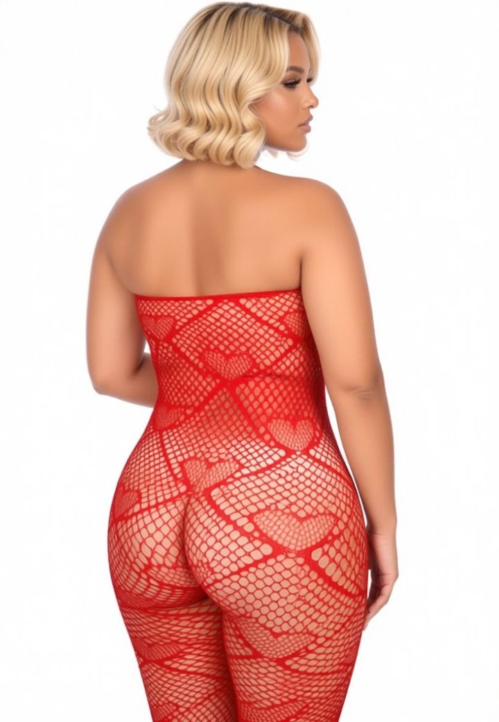 Doçura e ousadia unem-se neste bodystocking vermelho em rede transparente com padrão de corações, realçado por strass aplicados apenas nos corações. O decote halter elegante valoriza os ombros, enquanto a abertura na entreperna reforça o carácter expressivo da peça.
