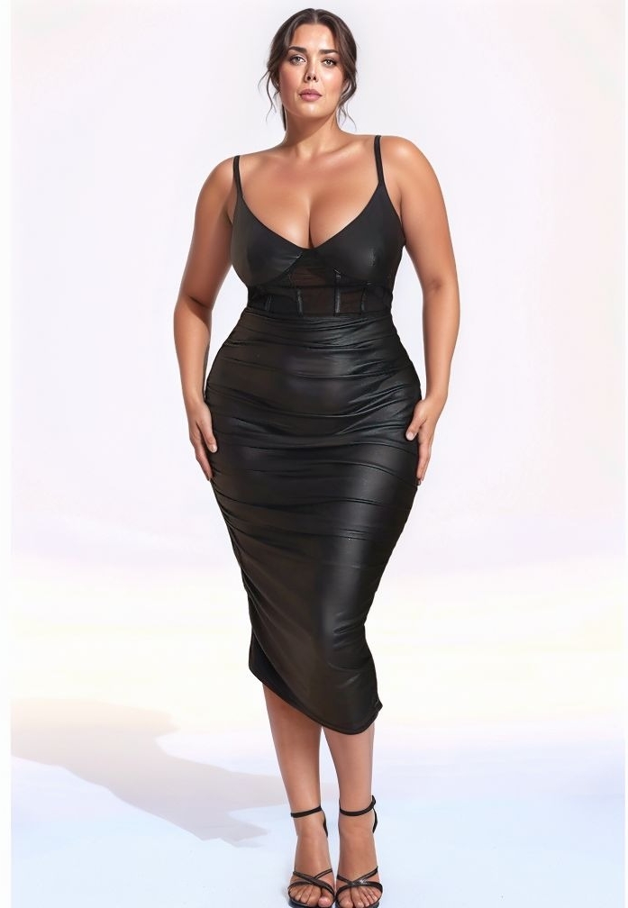 Descubra este vestido espetacular em pele sintética elástica que revoluciona a arte do glam rock! O seu design sem alças combina pele sintética e rede transparente, e as suas pregas laterais criam uma silhueta perfeitamente esculpida.