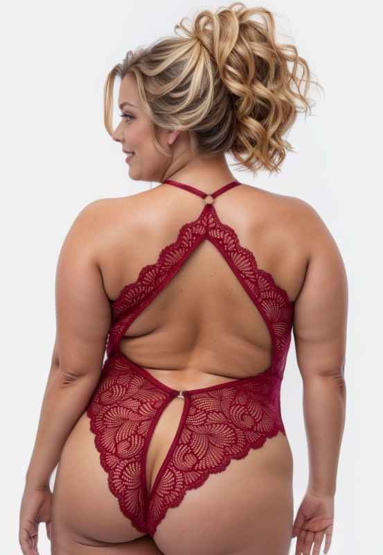 Descubra este body contemporâneo de renda ondulada que realça as suas curvas generosas com o seu decote ousado e as suas sensuais costas abertas.