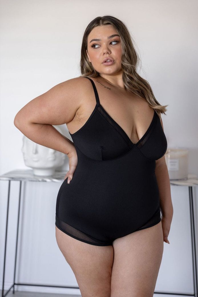 Um body que combina sedução e suporte. Design sofisticado com inserção de renda e compressão integrada para uma confiança absoluta.