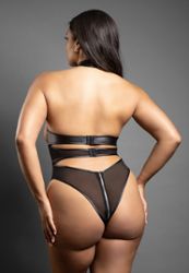 Um teddy preto de gola alta estilo halter, mistura de tule e courino, feito para a provocação pura. O corte cupless e o detalhe de zíper criam uma tensão ultra erótica: perfeito quando você quer sugerir tudo… e muito mais.
