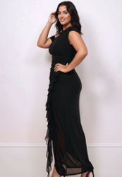 Vestido grande assimétrico em voile preto com ombros à mostra